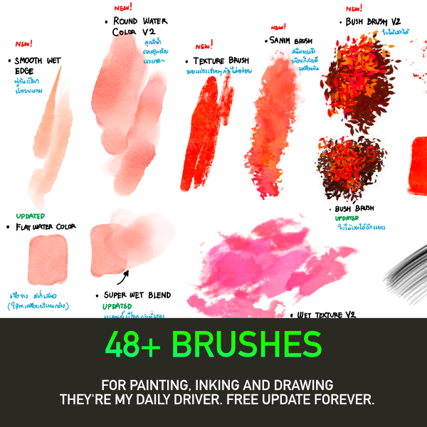 This brush pack contains 6 sets - Standard(STD), Inking, Painting, Nature, FX, V6(new!). Each set is optimized for particular tasks. Total is 48+ brushes.